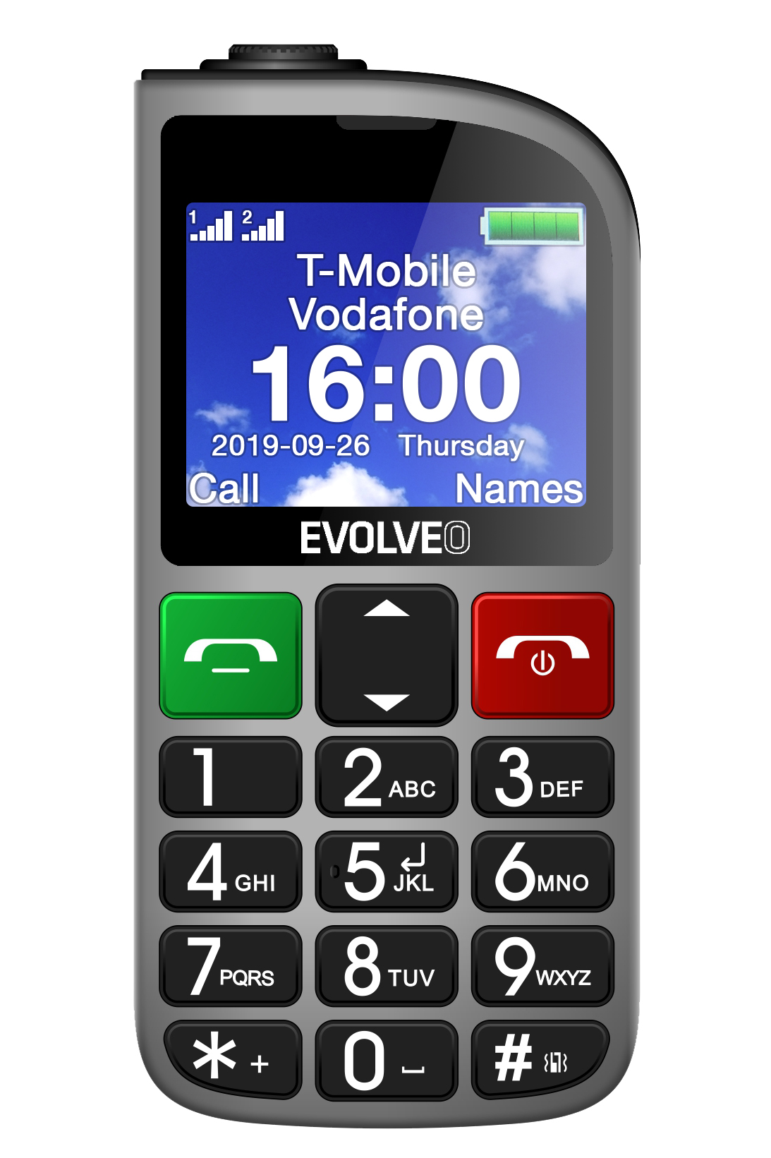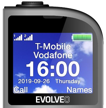 EVOLVEO EasyPhone FM, mobilní telefon pro seniory s nabíjecím stojánkem (stříbrná barva)