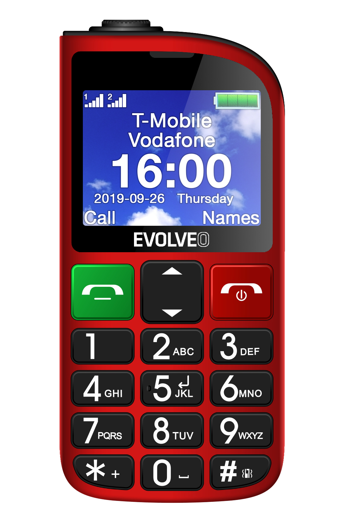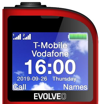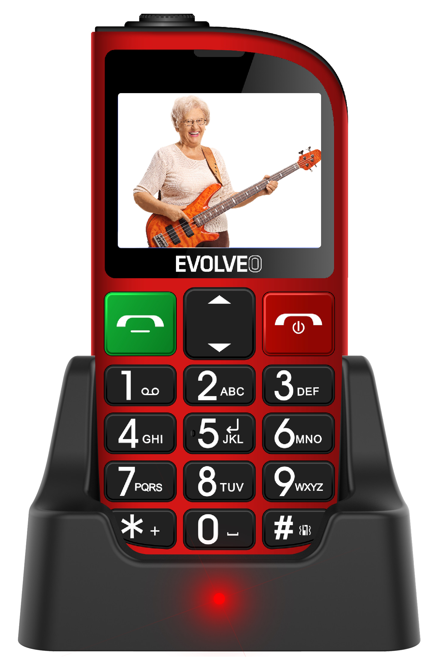 EVOLVEO EasyPhone FM, mobilní telefon pro seniory s nabíjecím stojánkem (červená barva)