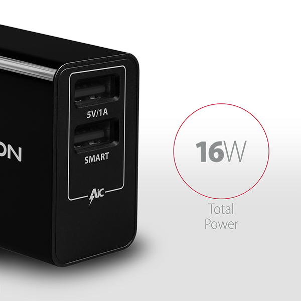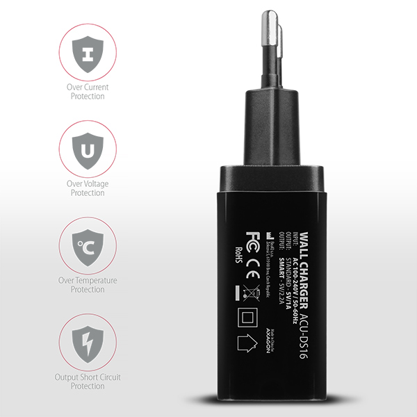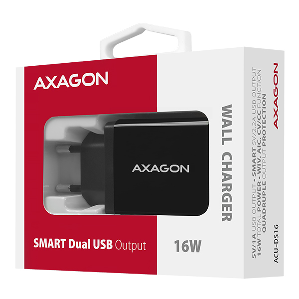 AXAGON ACU-DS16, SMART nabíječka do sítě, 2x USB výstup 5V/2.2A + 5V/1A, 16W