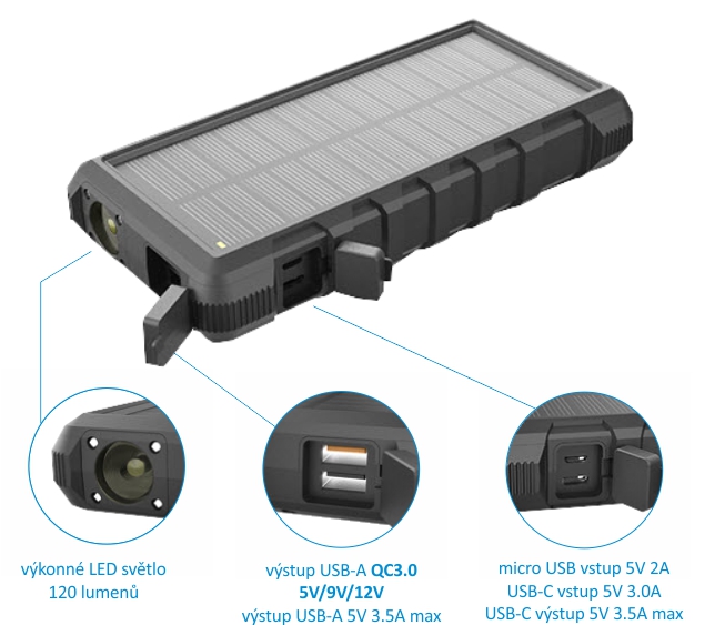Solární powerbanka VIKING W24 24000mAh, Outdoorová s IP67, Podpora rychlonabíjení QC3.0, USB-C,