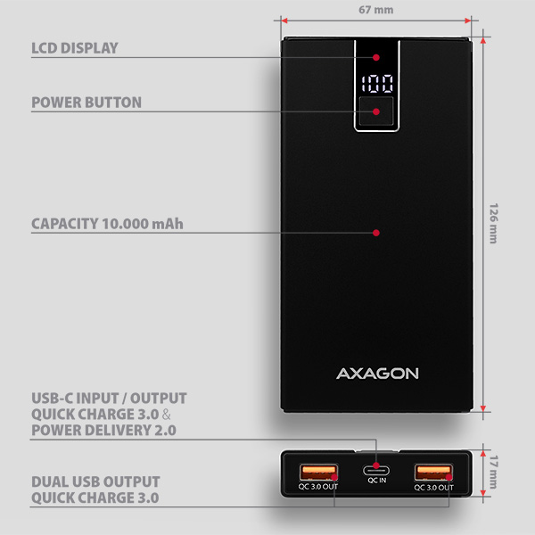 Powerbanka AXAGON PWB-L10QC Li-pol 10000 mAh