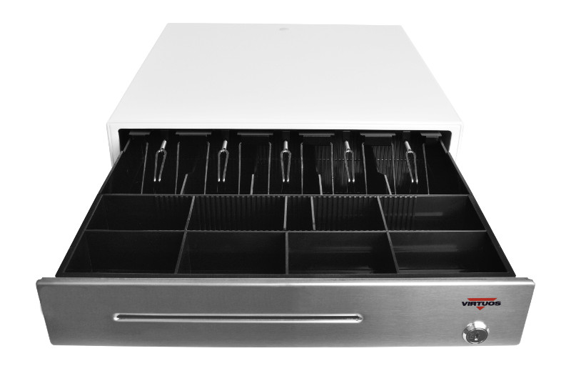 Pokladní zásuvka C430C - s kabelem, kovové držáky, nerez panel, 9-24V, bílá