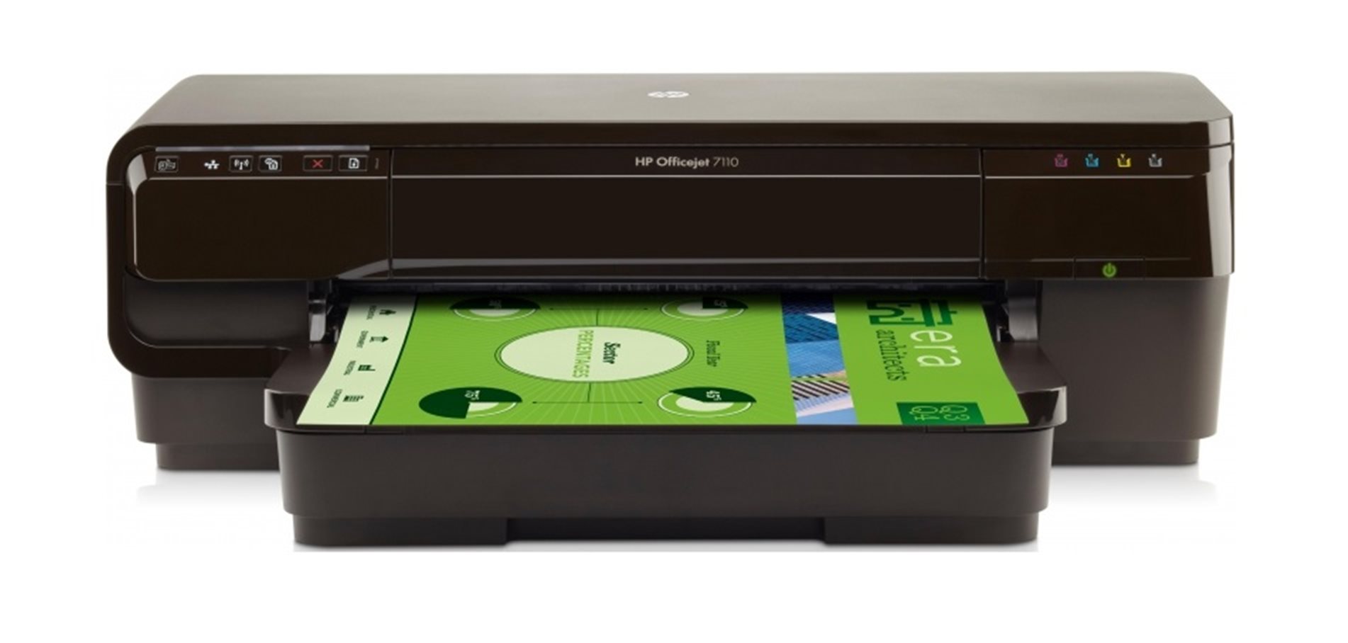 Barevná inkoustová tiskárna, A3+ • Oddělené čtyři tiskové kazety • Bezdrátový adaptér WiFi • Rychlost tisku až 32 str./min. (A4) HP Officejet 7110 je určena pro malé a středně velké firmy, které požadují cenově dostupný tisk profesionální kvality s možností bezokrajového tisku v řadě formátů do velikosti A3+. Připojit se můžete pomocí USB nebo i do sítě a to jak pomocí ethernetu, tak i bezdrátově přes WiFi. S funkcí HP ePrint tisk