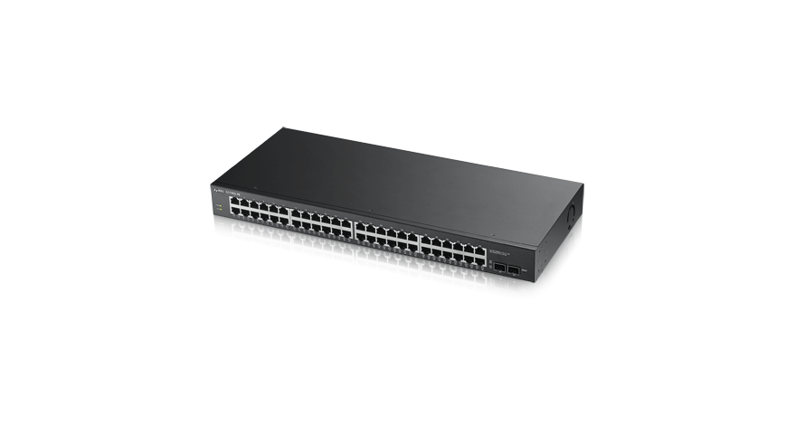 ZyXEL 48xGb+2xSFP IPv6 WebSmart GS1900-48 50-port Gigabit Web Smart switch: 48x Gigabit metal + 2x SFP, IPv6, 802.3az (Green), Easy set up wizard, 19" rackmount SPECIFICATIONS PORT DENSITY 10/100/1000BASE-T, fixed • 48 SFP 100/1000 Mbps • 2 PERFORMANCE Switching capacity (Gbps) • 100 Switch forwarding rate (Mpps) • 74 Packet buffer (byte) • 1.5 M MAC address • 8 K Jumbo frame (byte) • 9 K POWER Input voltage of AC • 100 - 2