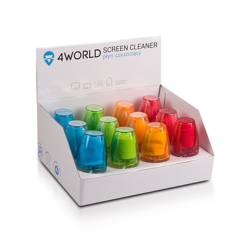 4World 12x Čistící Gel 50ml + hadřík BOX 12x balení + kartonový box čistící gel vhodný pro smartphony, tablety, GPS, notebooky, monitory, televise, kamery objem 50ml v balení hadřík 15x15 cm výška 8.5 cm Barva 3x BLUE, 3x GREEN, 3x ORANGE, 3x PINK