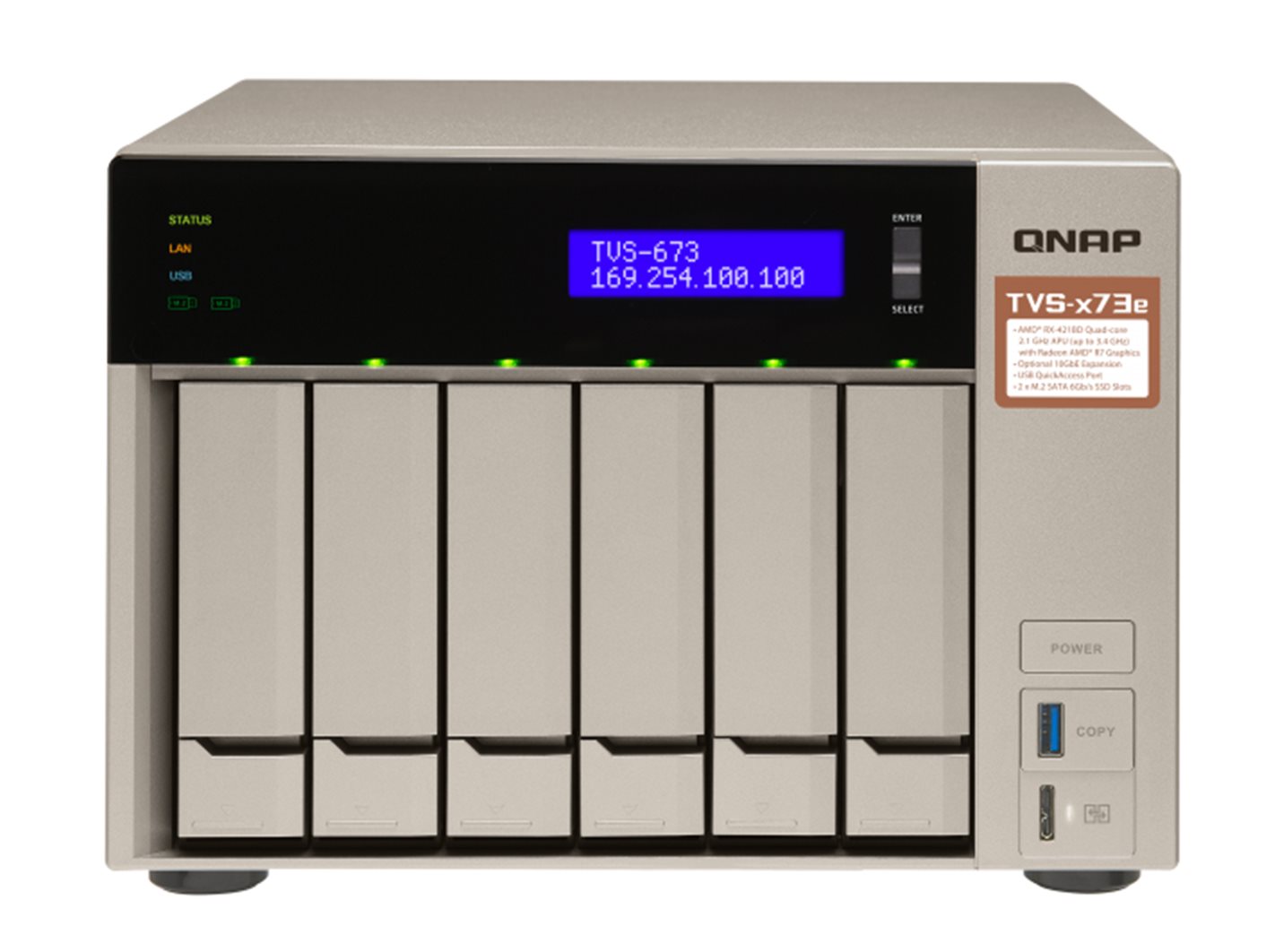 TVS-673e Kombinace výkonu a funkčnosti: Ve výbavě čtyřjádrové APU AMD RX-421BD, výjimečný výpočetní a grafický výkon s možností PCIe rozšíření Odkaz na web výrobce: https://www.qnap.com/cs-cz/product/tvs-673e Seznam kompatibility pro tento model: https://www.qnap.com/cs-cz/compatibility/?model=297