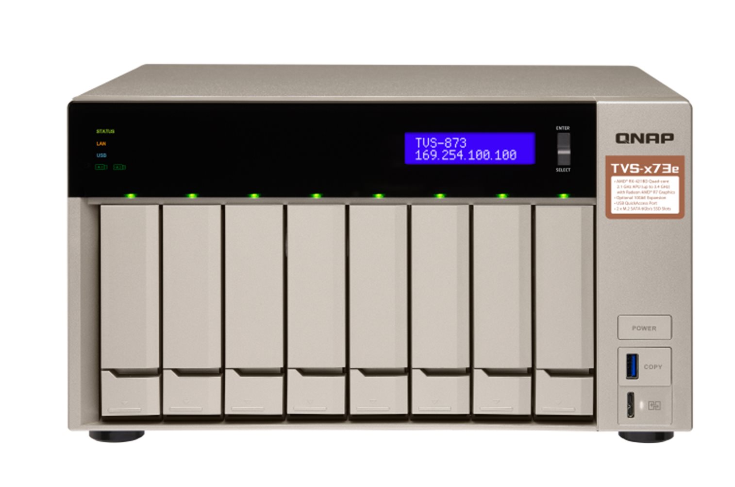 TVS-873e Kombinace výkonu a funkčnosti: Ve výbavě čtyřjádrové APU AMD RX-421BD, výjimečný výpočetní a grafický výkon s možností PCIe rozšíření Odkaz na web výrobce: https://www.qnap.com/cs-cz/product/tvs-873e Seznam kompatibility pro tento model: https://www.qnap.com/cs-cz/compatibility/?model=298